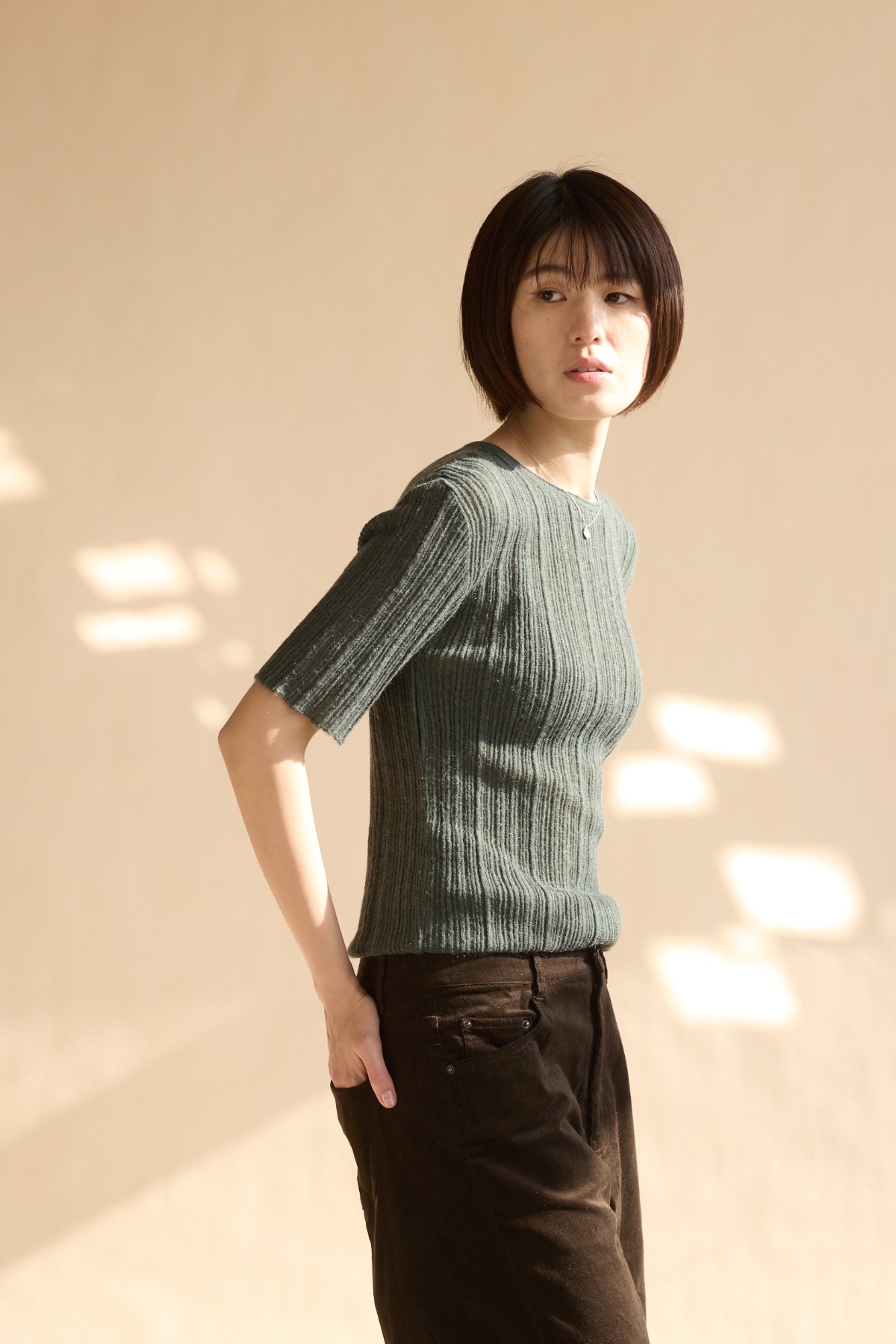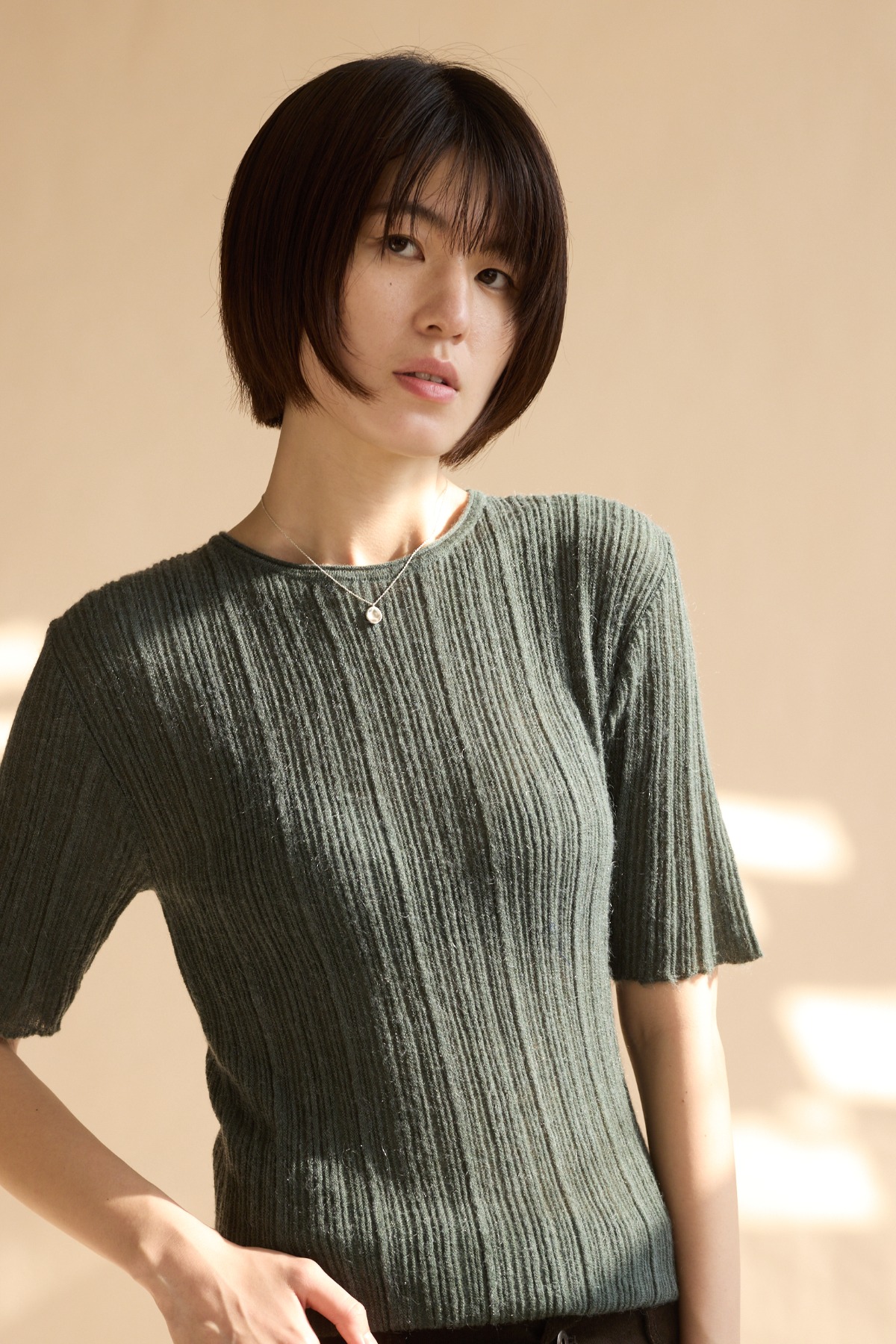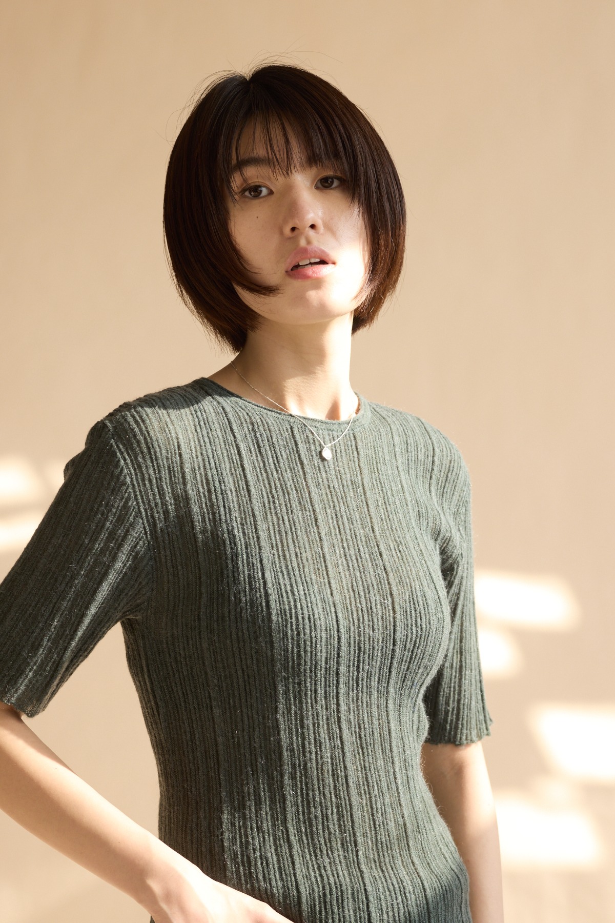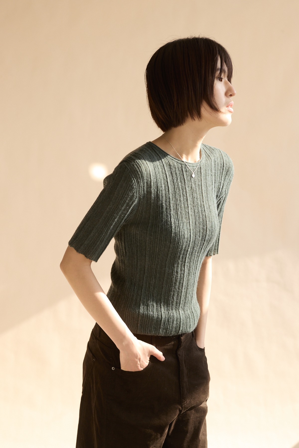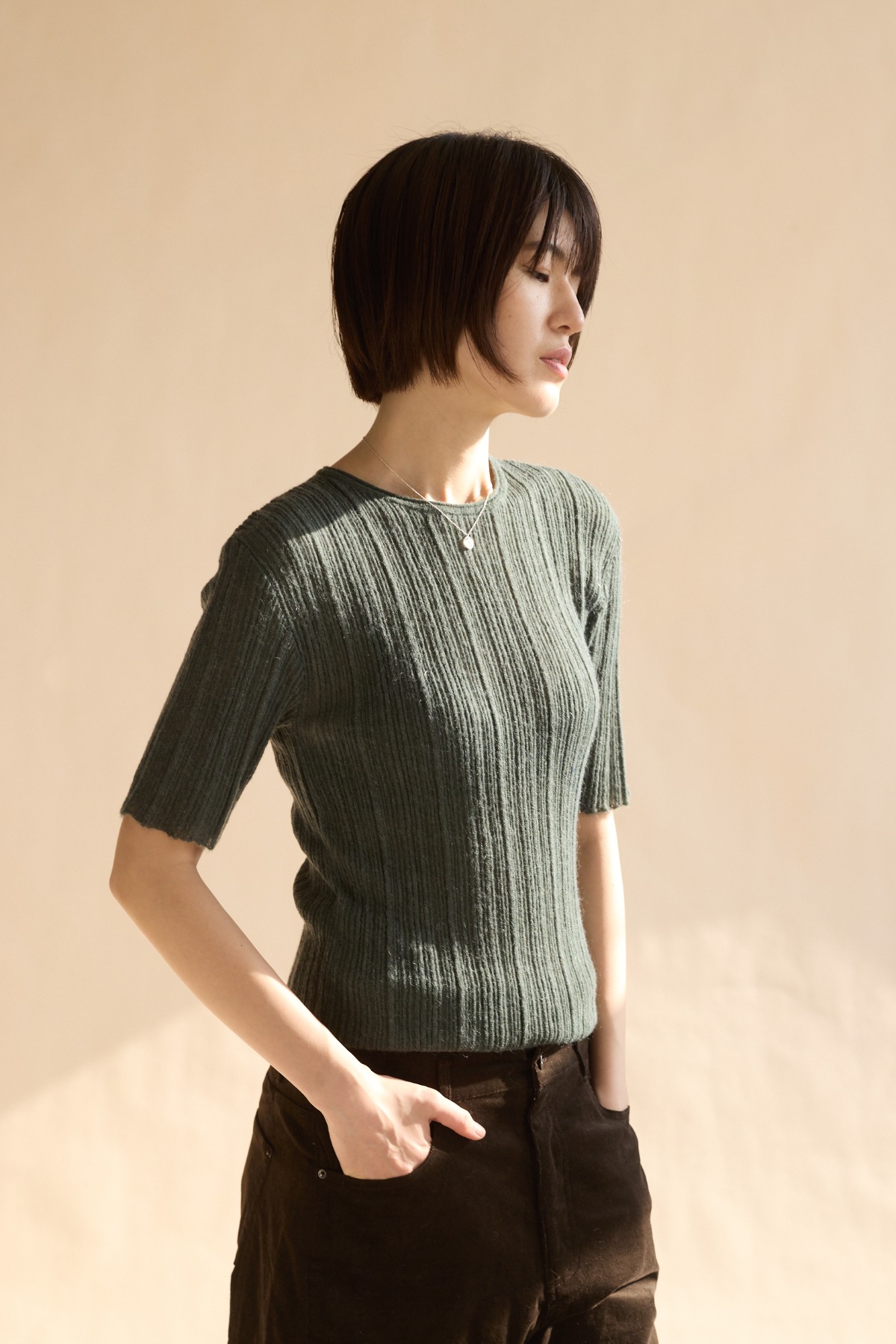 羊毛壓條順身版型五分袖上衣/霧綠、雪白