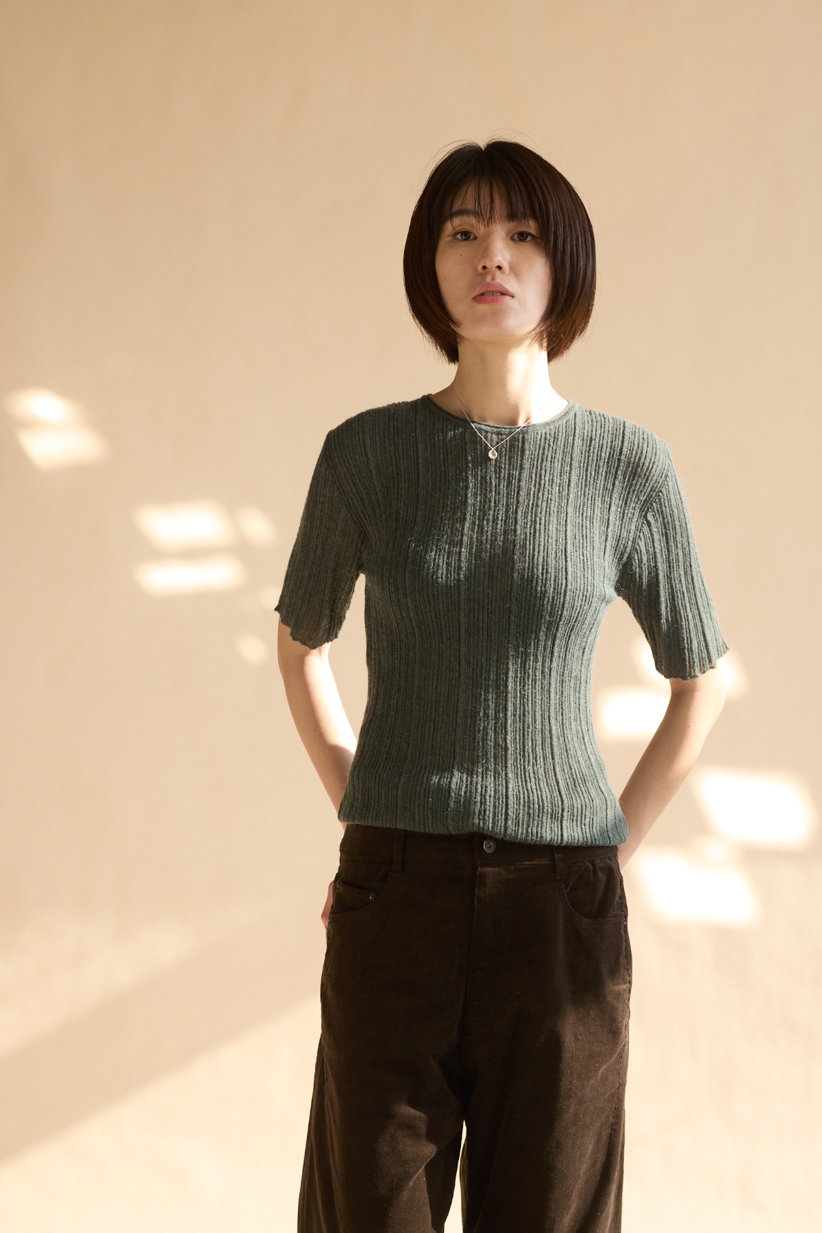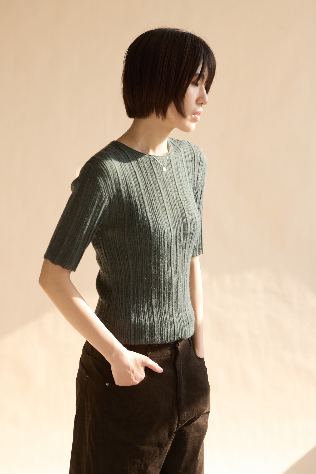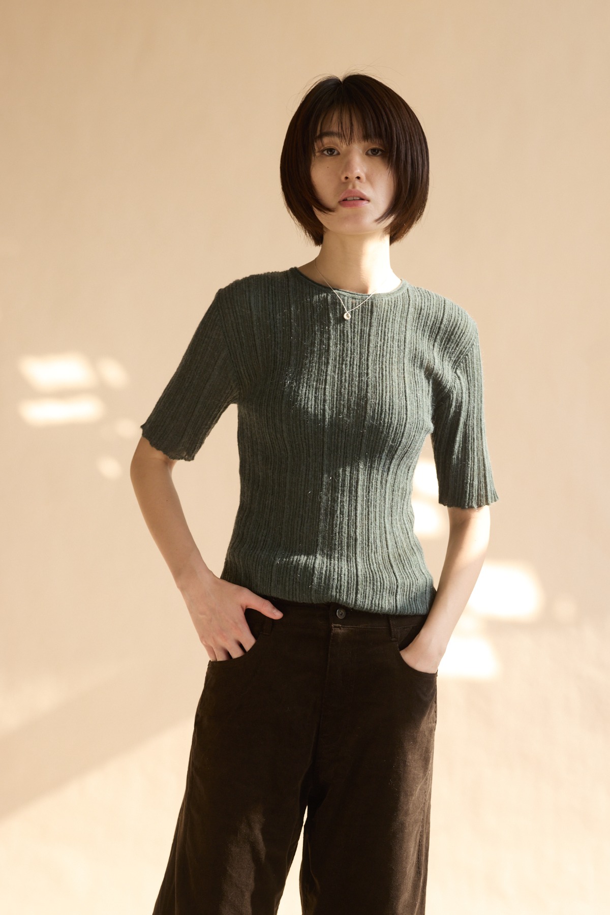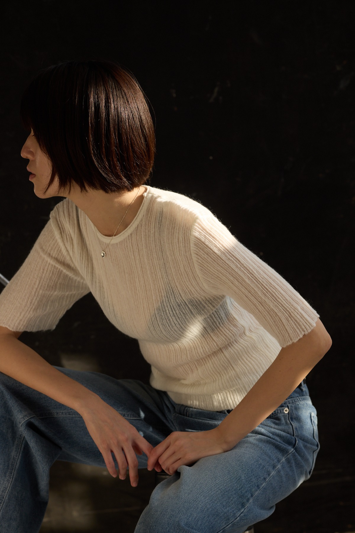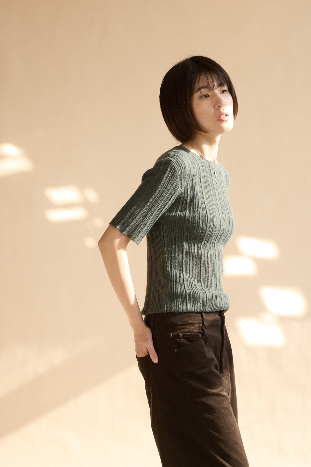 羊毛壓條順身版型五分袖上衣/霧綠、雪白