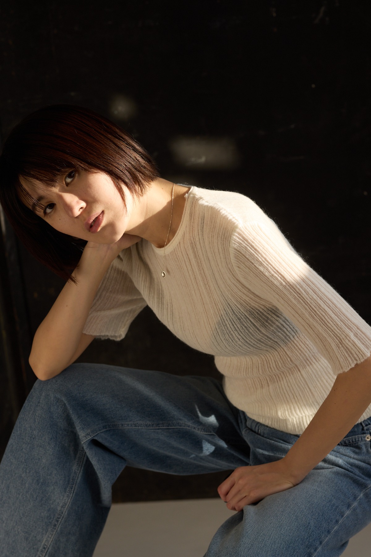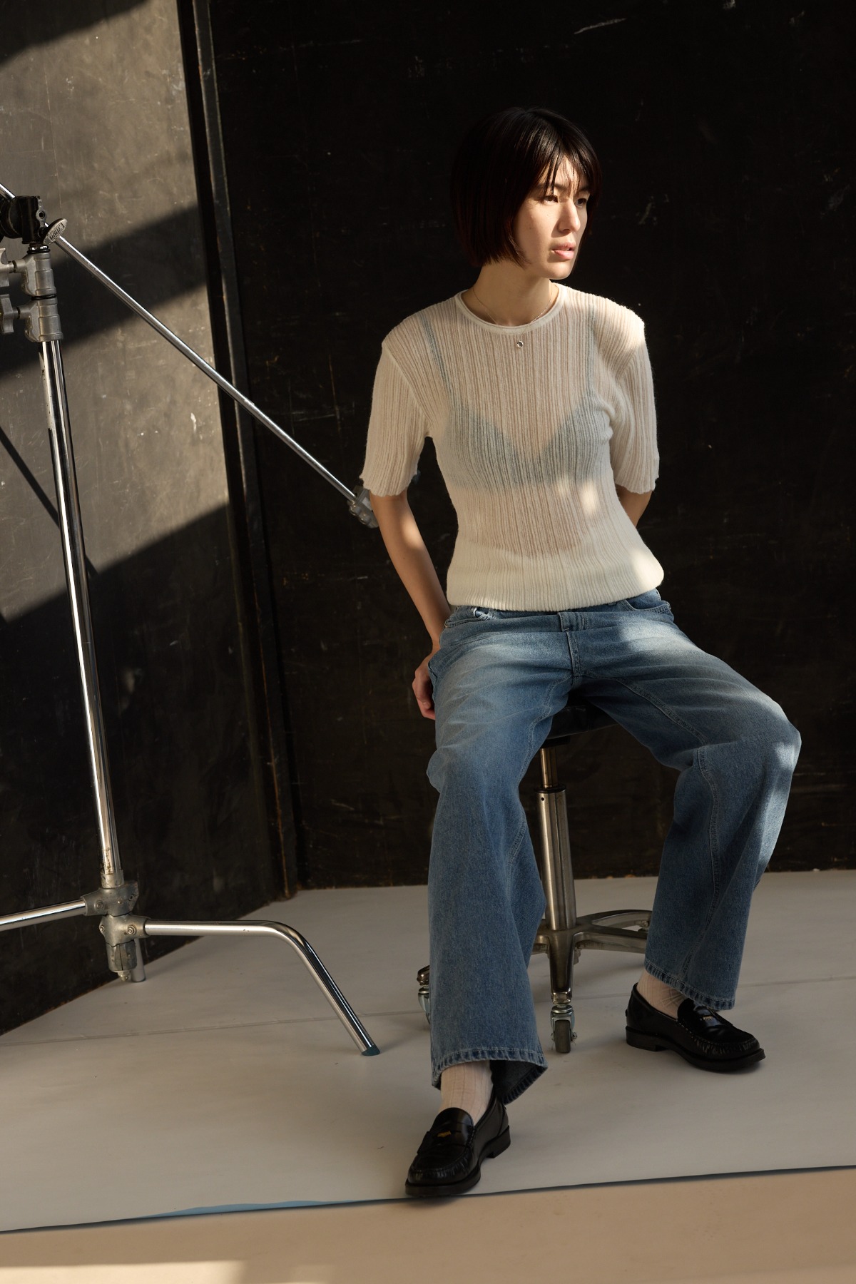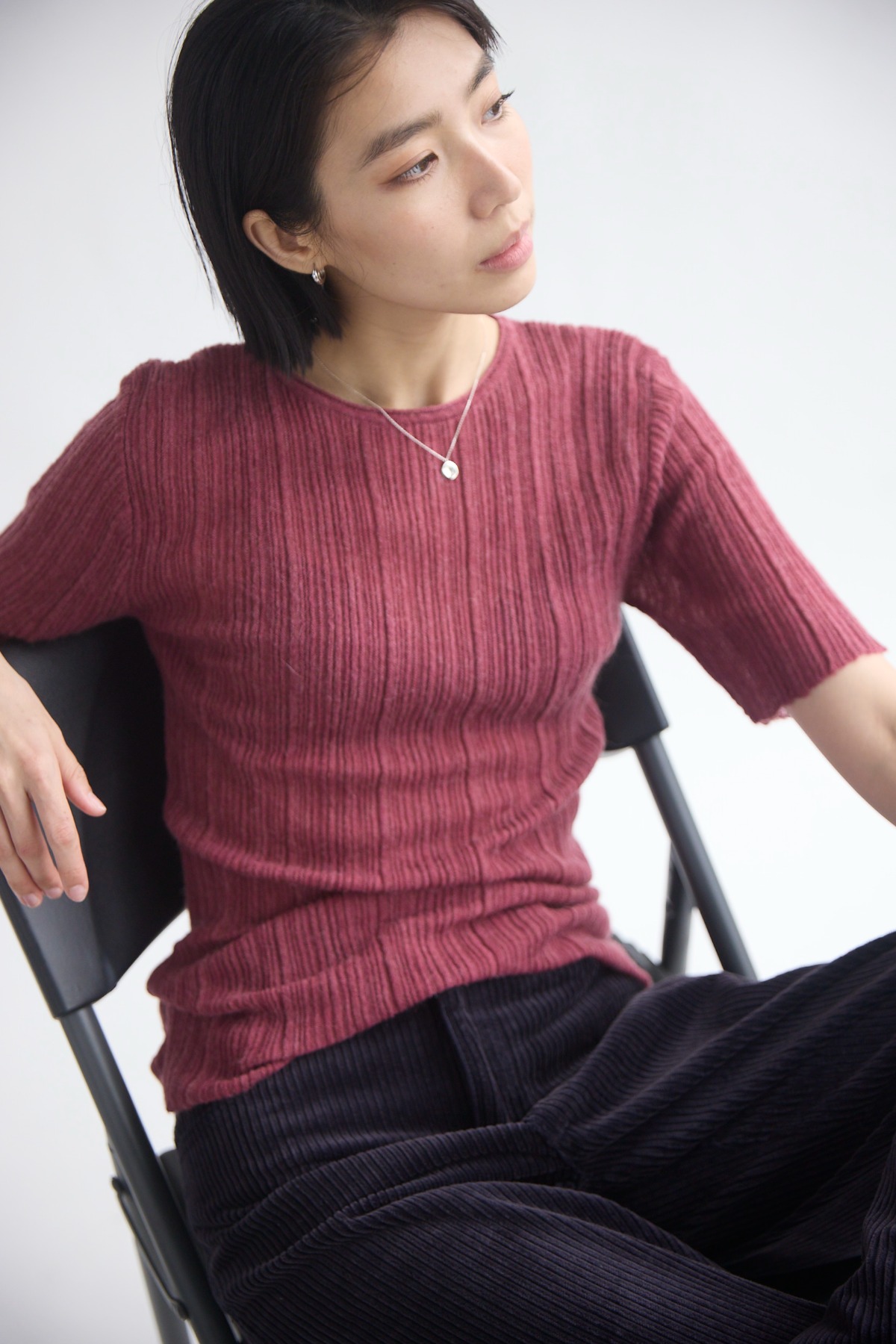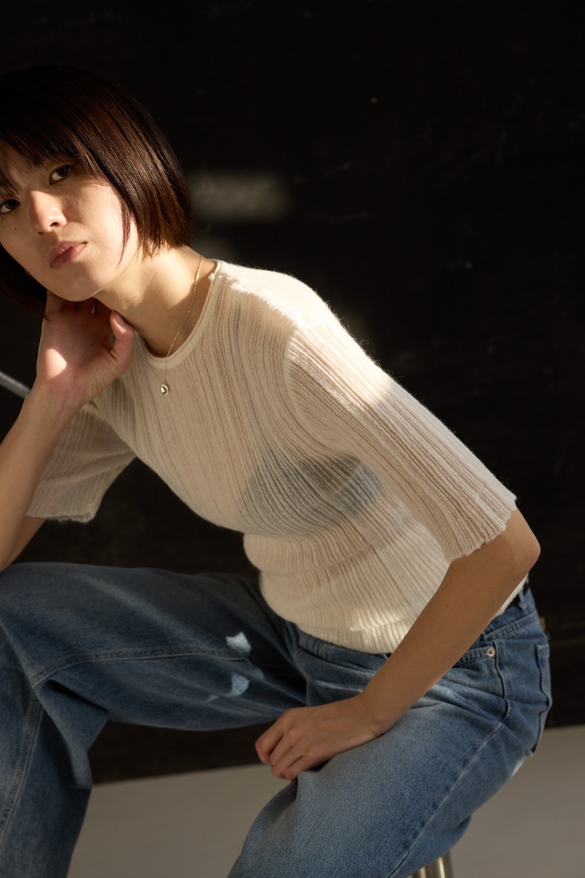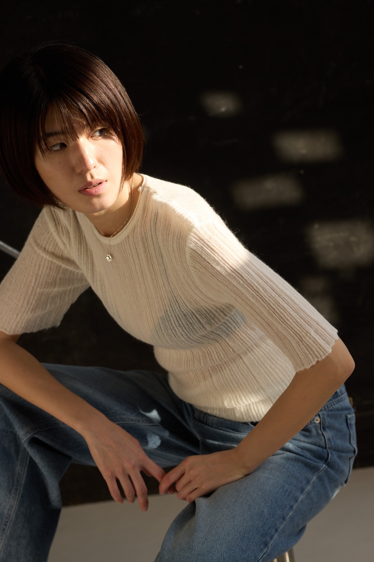 羊毛壓條順身版型五分袖上衣/霧綠、雪白