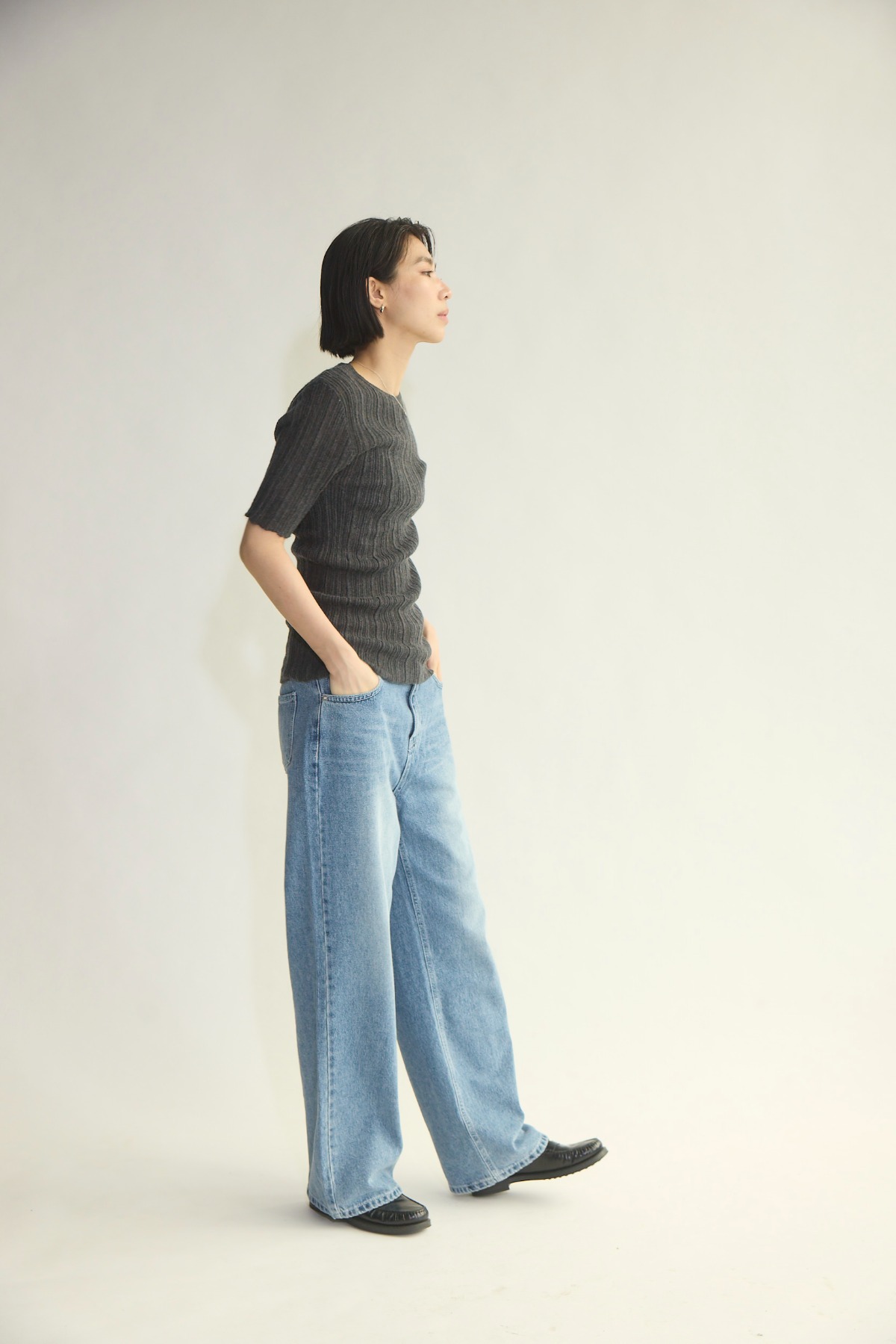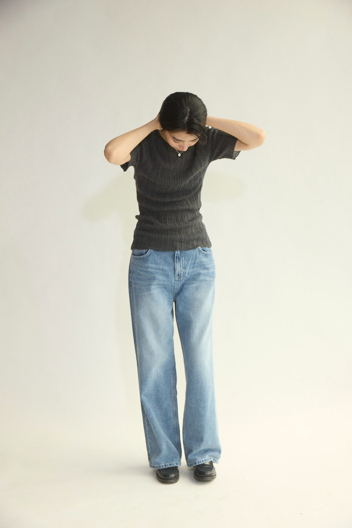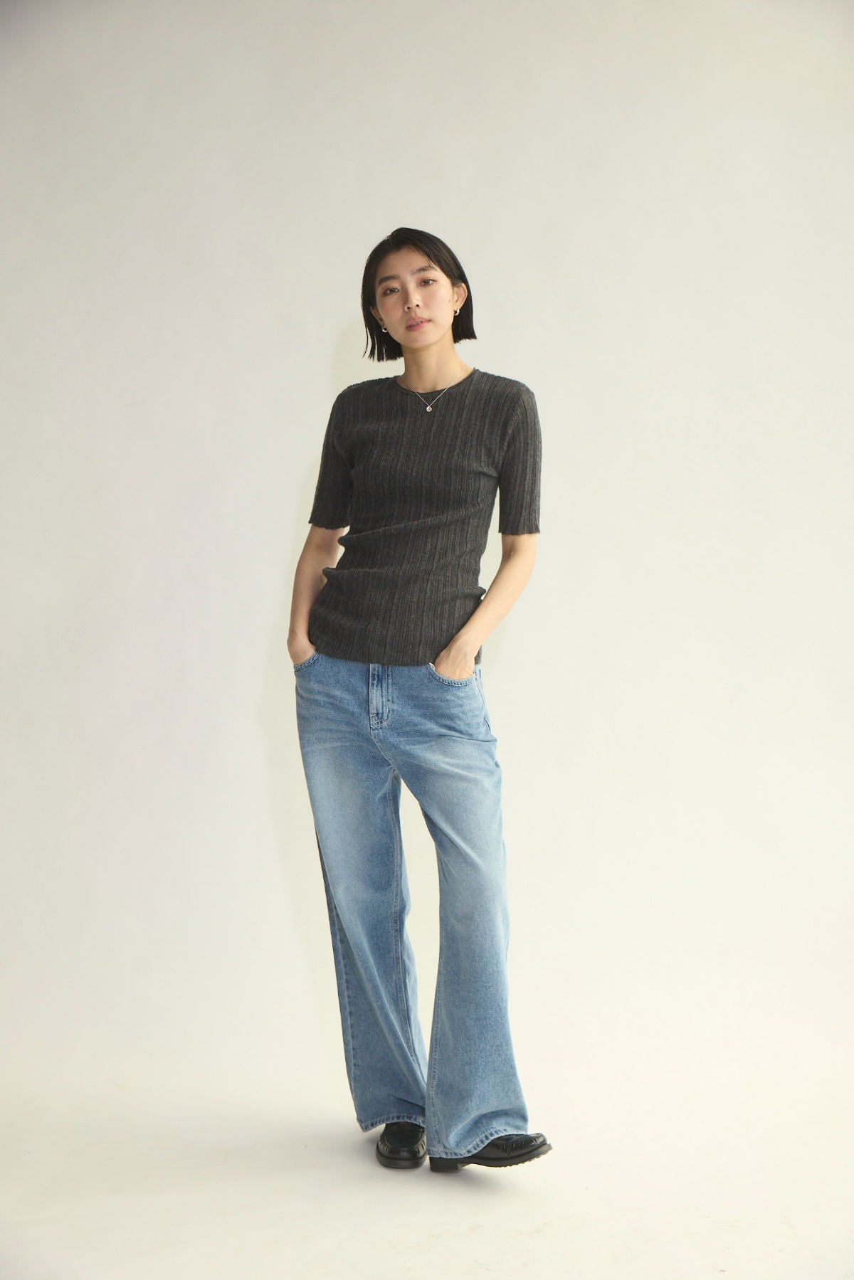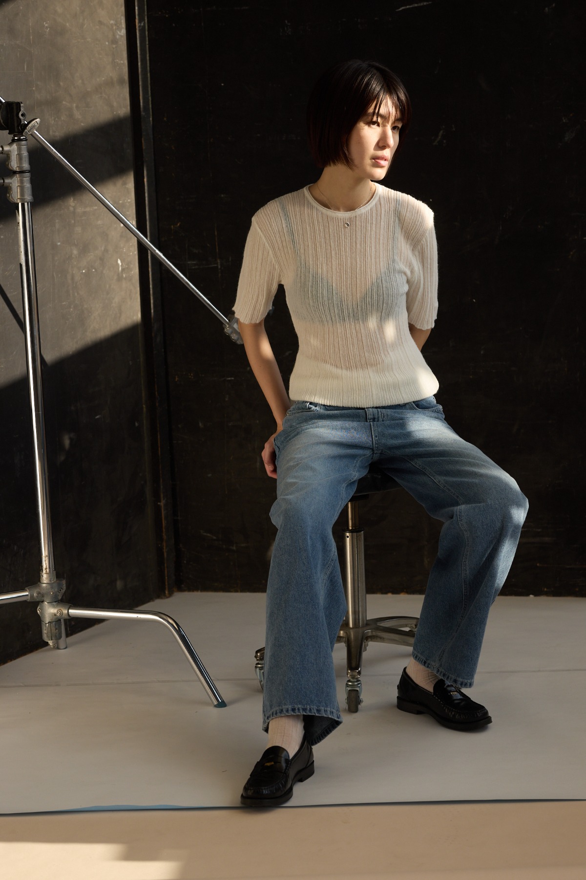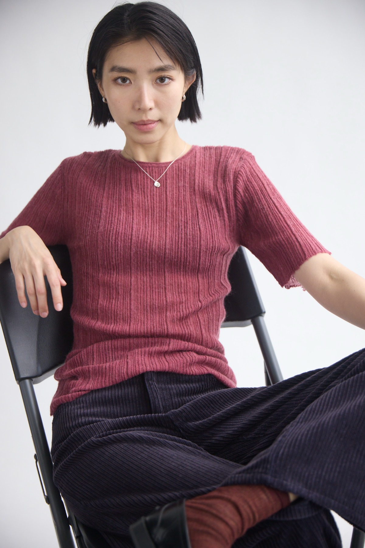 羊毛壓條順身版型五分袖上衣/霧綠、雪白